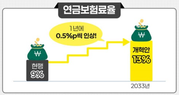 보험료 부담 증가 가능성: 연금 재정을 유지하기 위해 보험료율이 점진적으로 인상될 가능성이 있습니다. 현재 9%인 보험료율을 향후 13%까지 올리는 방안도 검토 중입니다.