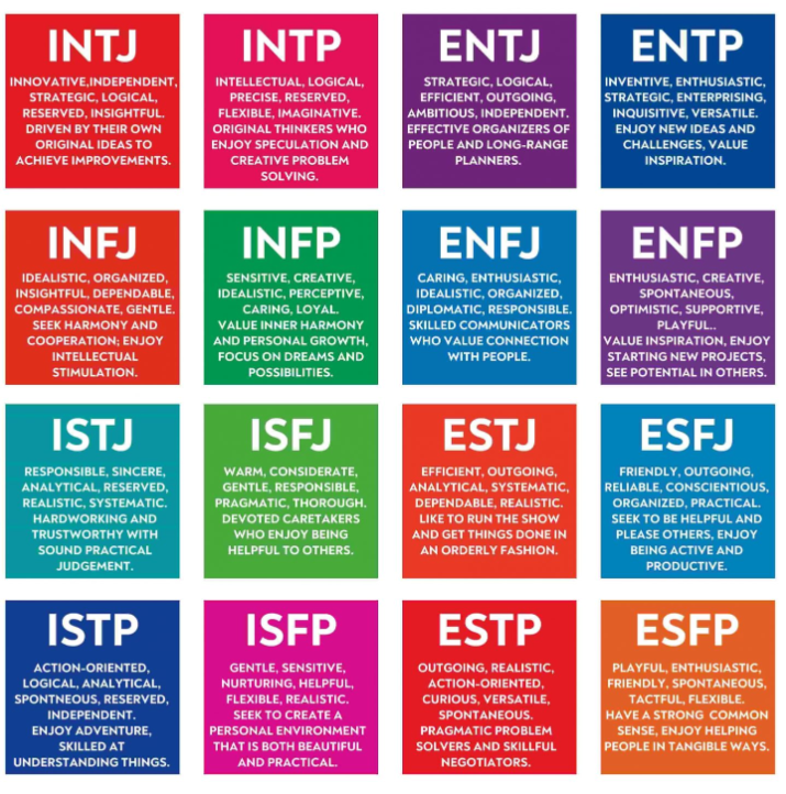 이 검사에서는 외향(E) vs. 내향(I), 감각(S) vs. 직관(N), 사고(T) vs. 감정(F), 판단(J) vs. 인식(P)의 4가지 지표를 조합하여 성격 유형을 정의합니다.