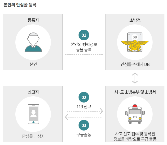 119안심콜서비스란 위급상황 발생시 구급 대원이 질병 및 특성을 미리 알고 신속하게 출동하여 맞춤형으로 응급처치와 병원 이송이 가능한 서비스입니다. 이 서비스는 일반적인 119 신고와는 달리, 사전에 등록된 개인정보를 바탕으로 구급대원이 현장 도착 전부터 환자의 상태를 파악할 수 있게 확인 가능합니다.