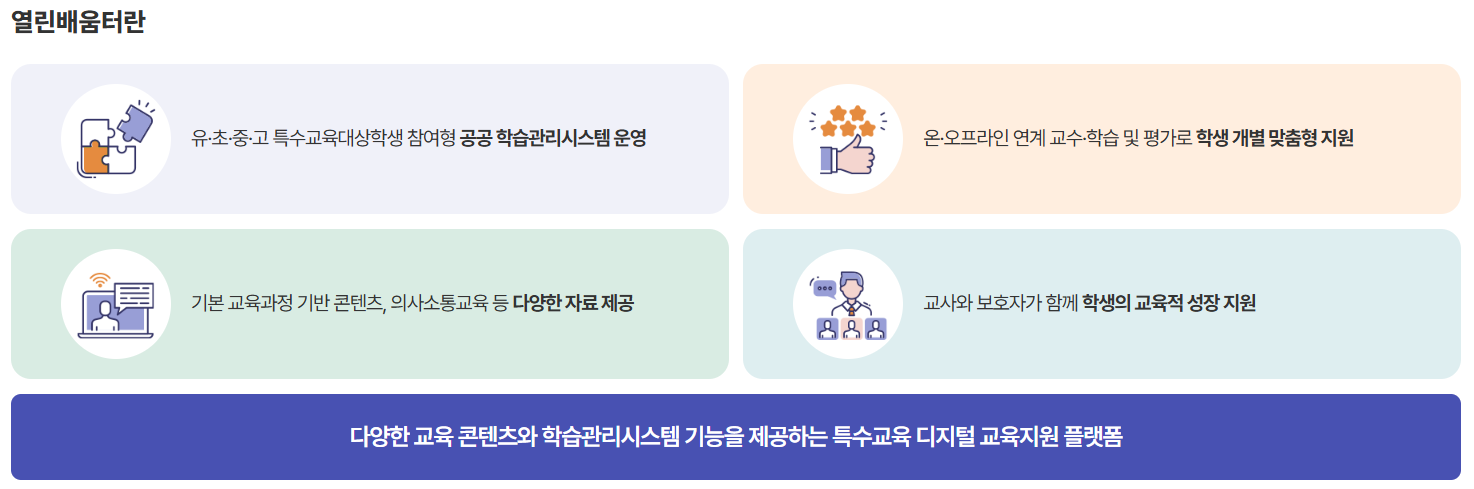 열린배움터는 장애학생 디지털 교육 지원 플랫폼으로, 특수교육 교육과정 콘텐츠 제공 및 의사소통교육 지원.