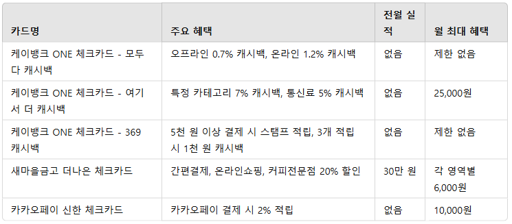 2025년 3월 기준, 혜택이 우수한 체크카드를 소개합니다. 체크카드는 연회비가 없고, 전월 실적 부담이 적어 과소비를 방지하는 데 도움이 됩니다. 또한, 실시간 결제가 이루어져 계좌 잔액을 바로 확인하며 소비할 수 있어 금전 관리에도 유리합니다. 하지만 아무리 좋은 카드라도 본인의 소비 패턴에 맞지 않으면 의미가 없습니다. 따라서 카드 혜택만 보지 말고, 주로 사용하는 사용처의 할인율이 높은 카드를 선택하는 것이 중요합니다.